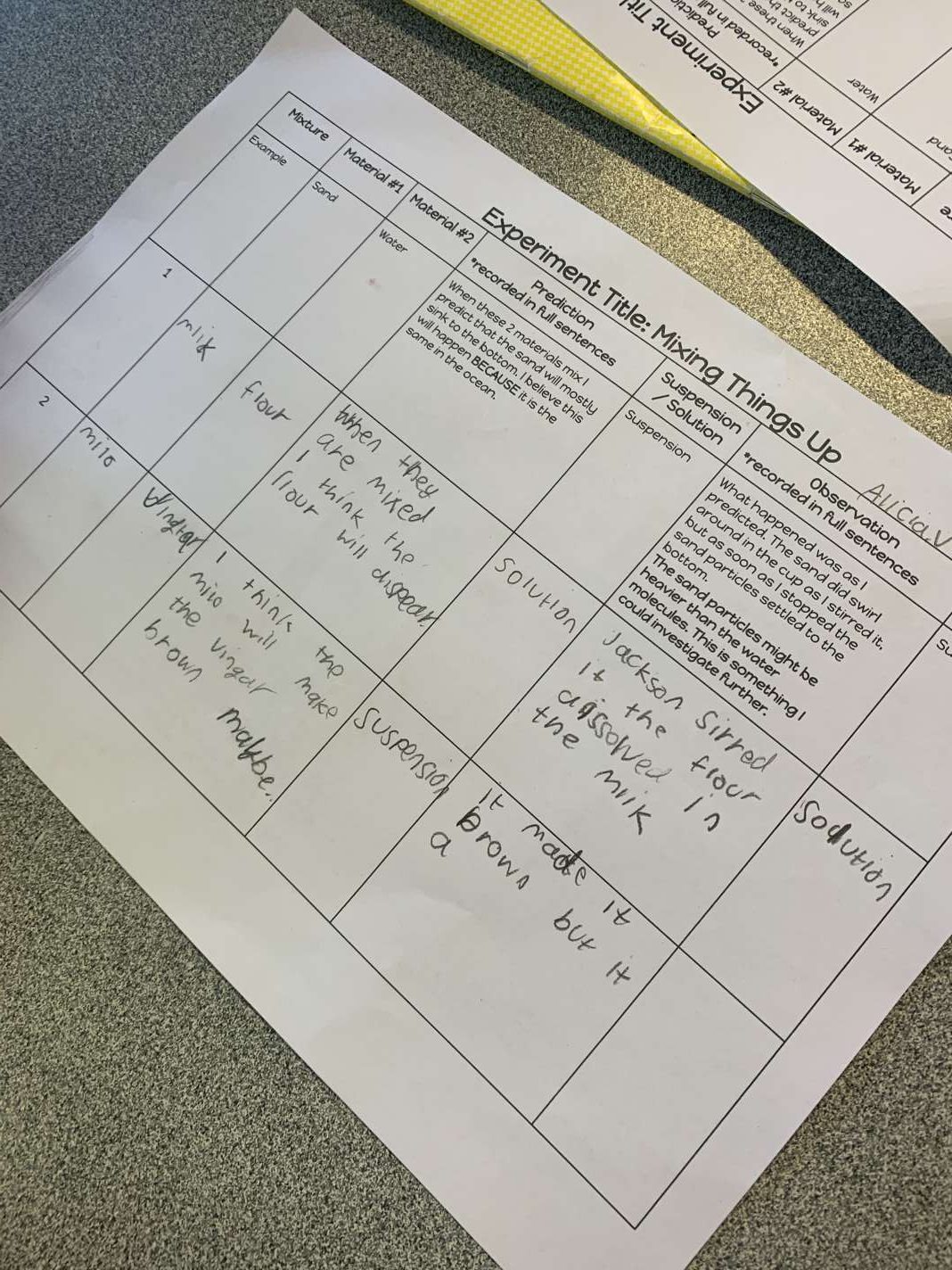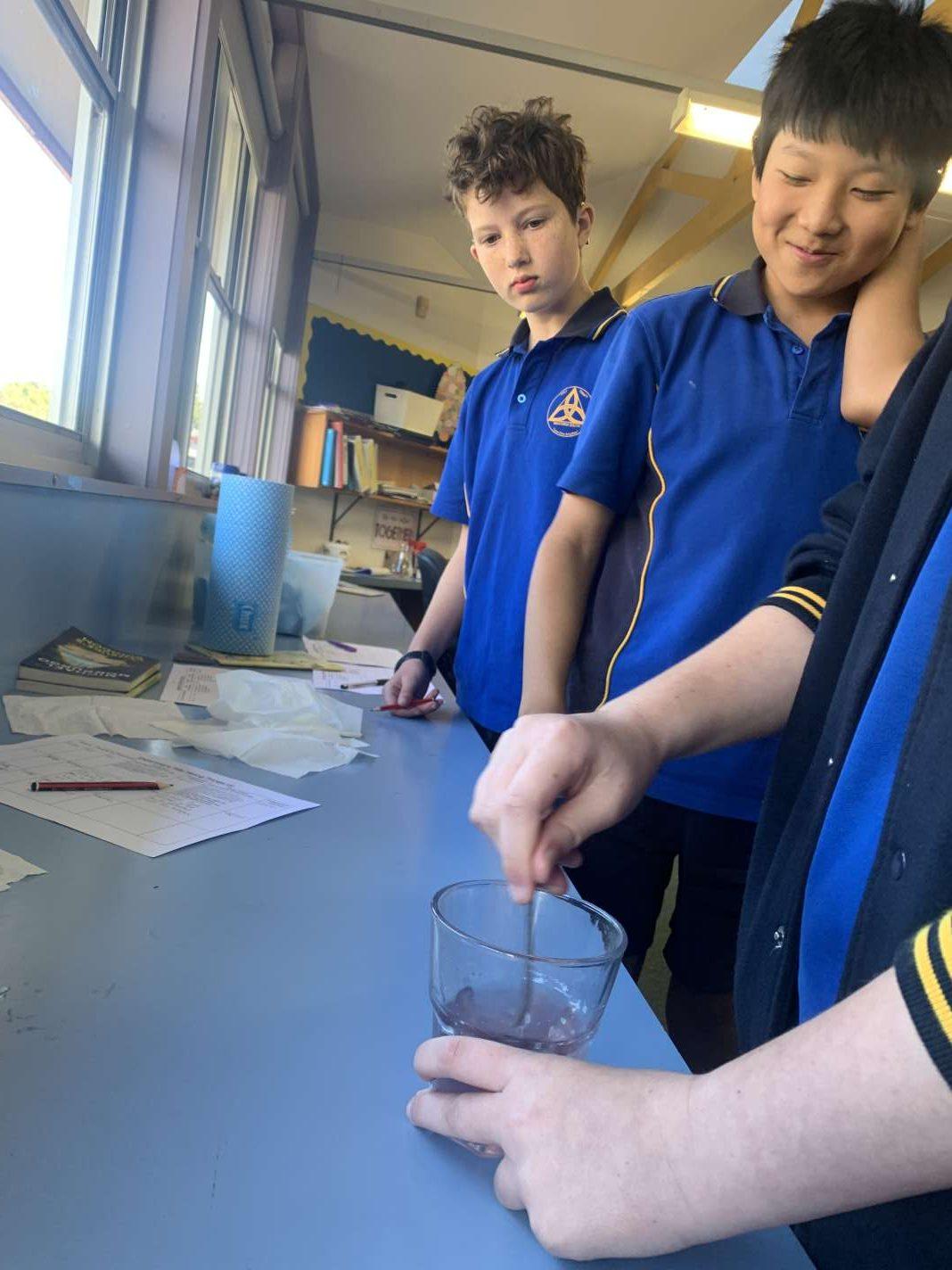 As part of the 5/6 students' English Knowledge-Based Unit, students are learning about solutions and suspensions. Students had to predict what mixed substances would result in a solution or a suspension and then test their theories by mixing them.